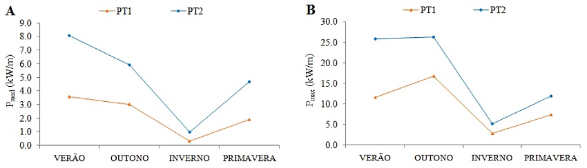 Como na Figura 15, o potencial médio mais expressivo de energia das ondas existe no verão, cuja média alcança os 3,57 kW/m no PT1 e 8,07 kW/m no PT2. Diferentemente das médias que se concentram no verão, os valores máximos são mais elevados no início do outono, com 16,7 kW/m e 25,9 kW/m. Com relação ao inverno, há uma redução expressiva tanto nos valores médios (0,03 e 0,9 kW/m) quanto nos valores máximos (2,7 e 5,2 kW/m), respectivamente PT1 e PT2. Na primavera, quando a ZCIT começa a se deslocar no sentido do HS, verifica-se um aumento das médias (1,8 e 4,6 kW/m) e máximas (7,3 e 11,9 kW/m) do potencial de energia da onda nas duas estações costeiras.