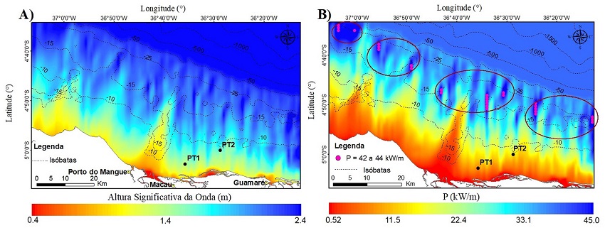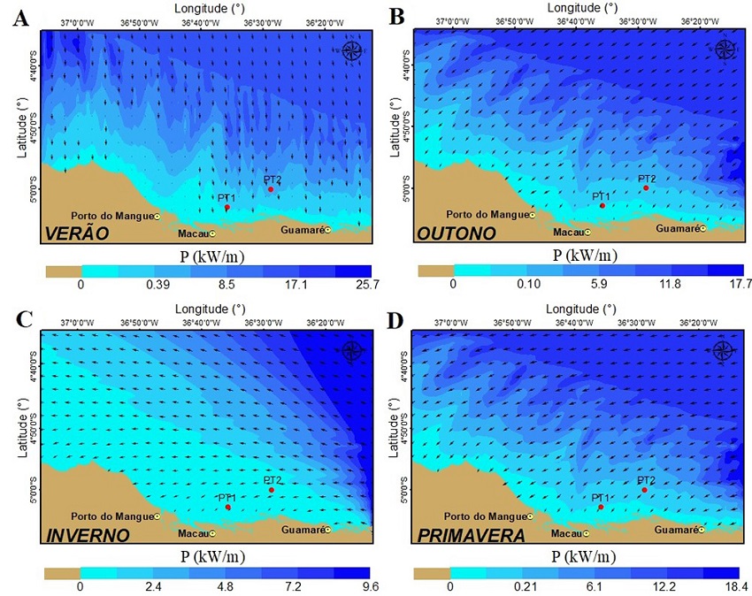 A variabilidade sazonal é uma característica marcante deste litoral, causadas pelas alterações de deslocamento e comportamento dos sistemas frontais que intensificam o potencial de energia da onda. Outra característica evidente deste litoral são as propriedades do ambiente e dos fenômenos físicos associados à variabilidade sazonal. As condições de energias de ondas mais elevadas foram observadas nas regiões de águas profundas, sobretudo, na zona onde se evidencia a quebra do talude continental setentrional ( Almeida, Vital & Eichler 2017), a partir da isóbata de 70 m, onde as condições de alturas significativas são mais expressivas. Ao atingir o interior da plataforma continental, com profundidades inferiores a 70 m (onde os pontos se localizam PT1 e PT2), o potencial energético mostra-se reduzido durante o ano todo, sobretudo nos meses JJA, devido às condições de energia nas regiões costeiras serem muito diferentes em relação as águas profundas, em função da refração da onda e outros efeitos nas proximidades da linha de costa ( Barstow et al. 2008).