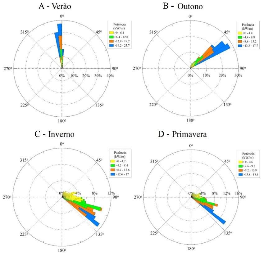 Durante o verão ( Figura 17A), o potencial de energia das ondas está associado às direções predominantemente de NNW e N, passando a propagar para o gradiente de NE e ENE durante o outono ( Figura 17B). Na medida em que se aproximam os meses que compõe o inverno ( Figura 17C), as incidências das energias das ondas tornam-se orientadas de ENE a ESE, acumulando até a primavera ( Figura 17D), cujas o potencial de energias das ondas está relacionado com as direções do componente ESE.
