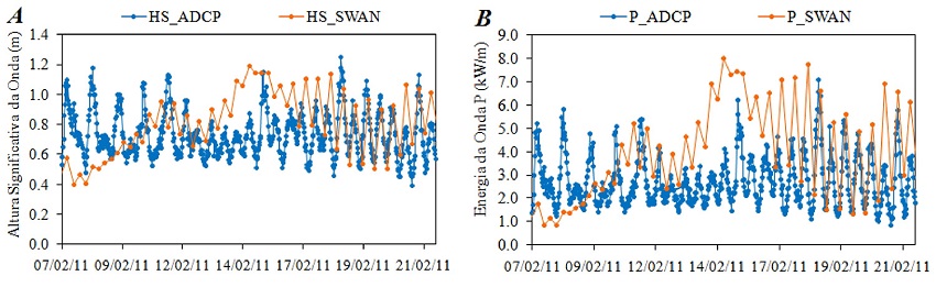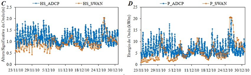As séries temporais da altura significativa e do potencial de energia das ondas medidas e simuladas mostram respectivamente, um bom ajuste entre os resultados do ADCP e do modelo SWAN, sobretudo no ponto PT2, embora ocorra uma ligeira subestimação dos valores de Hs.