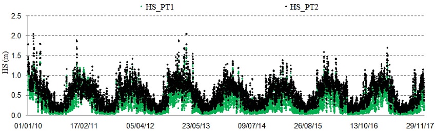 Entre os meses de dezembro a março, coincidindo com o ápice do verão e o início do outono na região, é o período de maiores alturas significativas, que variam de 0,5 m a 2,05 m. Valores acima de 2,0 m foram observados principalmente no PT2, durante o mês de fevereiro dos anos de 2010 e 2013. A partir de então, ocorreram menores alturas, sendo o período entre os meses de junho a setembro onde ocorreu a menor agitação marítima, ou seja, durante o período de inverno e início da primavera, com médias variando entre 0,1 m e 0,5 m.