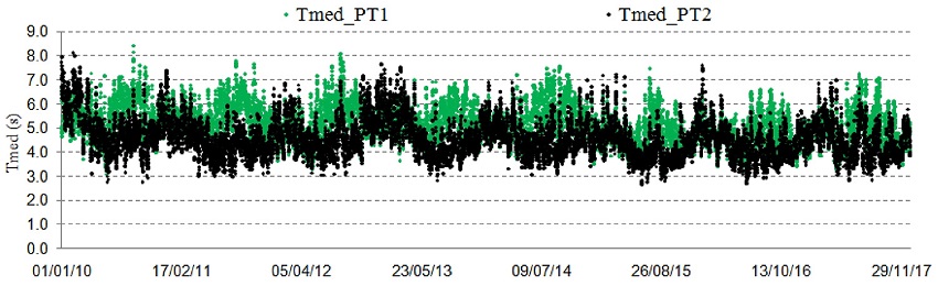 Em termos de períodos médios (Tmed), verificou-se que as ondas mais longas, com períodos de 7 s a 8,5 s, ocorrem nos meses que caracterizam o verão (DJF), reduzindo para ondas mais curtas, com períodos variando entre 3,06 s e 2,6 s (PT1 e PT2) durante o inverno na região.