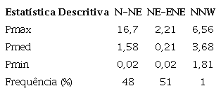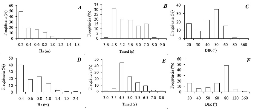 Embora ao longo do ano as direções médias variem de NNW a ENE, a distribuição das frequências da série temporal mostrou que a região é dominada por ondas de NE e ENE. As direções são relativamente constantes durante todo o ano. Isso indica que a geometria da plataforma continental setentrional, com orientação para NE, impede que os sistemas provenientes do HN penetrem com maior intensidade no Hemisfério Sul (HS) ( Semedo et al. 2011; Young 1999).