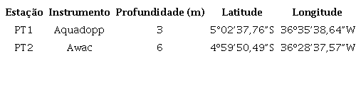 Os dados in situ foram medidos usando dois perfiladores acústicos de medição de ondas, o Acustic Wave and Current Meter (AWAC) e o AQUADOPP PROFILER, posicionados em profundidades de 3 e 6 m ( Tabela 1). Os levantamentos in situ ocorreram no período de 07 a 22 de fevereiro de 2011 (PT1) e de 23 de novembro de 2010 a 07 de janeiro de 2011 (PT2). Embora, a região tenha outras campanhas de levantamentos de dados de ondas, a opção por estas datas se deu em função de serem a maior quantidade de dias contínuos medidos em ambos os locais, sendo que as outras campanhas realizaram levantamentos com intervalo temporal de poucos dias.