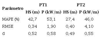 Para a análise quantitativa dos dados medidos e simulados, a Tabela 2 mostra os resultados da verificação para os períodos analisados conforme a temporalidade de medições em PT1 e PT2. Nota-se que o percentual MAPE apresentou valores abaixo da média de 50% em três casos, com exceção do valor do potencial de energia das ondas para o PT1, P = 53,08 %. Na análise do RMSE, a qualidade dos valores medidos e estimados foi bem conduzida em termos de Hs; o índice de concordância foi acima da média em ambos os casos de P, com d = 0,58 e d = 0,55, respectivamente.