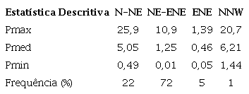 Em termos de distribuição de ocorrência, as maiores frequências do potencial de energia estão associadas às ondas que se propagam de NE-ENE e E-NE, ou seja, 51% e 72%, PT1 e PT2 ( Tabela 3 e 4). Contudo, o potencial máximo de energia está relacionado às condições de propagação menos frequentes, N-NE, 15,8 kW/m e 25,9 kW/m, seguidas do menor percentual (1%) que são propagações de NNW, 6,5 e 20,7 kW/m.