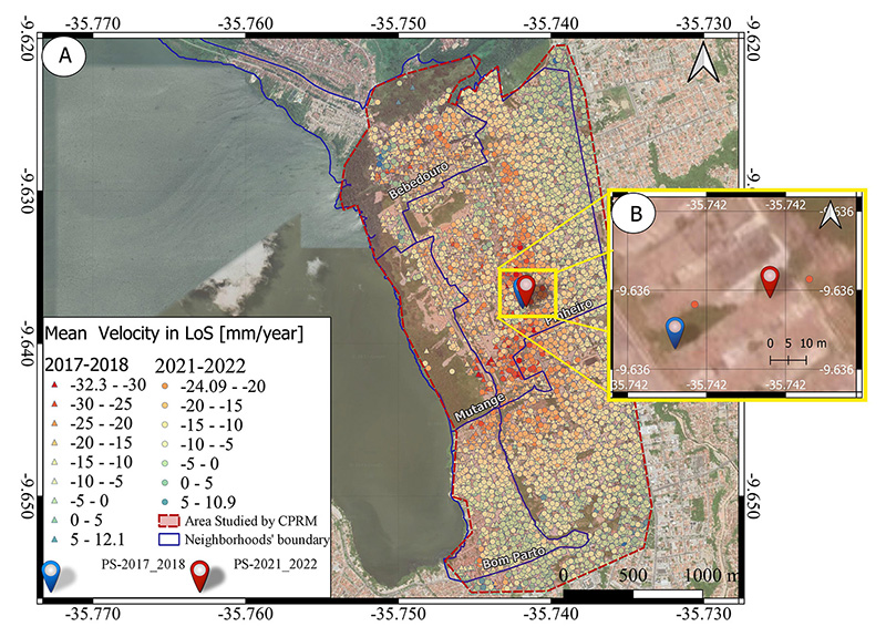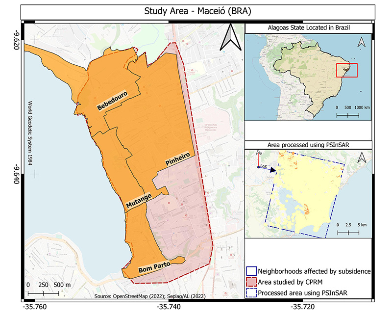 Due to the amount of SAR data and the possibility of processing these images through an open-source package, we decided to test the PSInSAR technique using the SNAP-StaMPS integration to identify subsidence phenomena in a location that has these occurrences. This area is located in the Pinheiro neighborhood of Maceió City (Alagoas, Brazil), where an earthquake occurred on March 3, 2018, consequently causing the emergence of numerous cracks in houses, buildings, and public roads (CPRM 2019). Thus, we processed Sentinel-1A SLC-SAR images acquired in descending mode in two ways: a) using SLC-SAR images acquired before and after the earthquake (2017-2018), and b) processing using recently acquired images to see how subsidence is progressing (2021-2022).