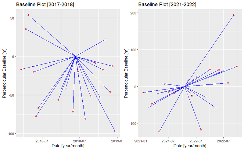 In the first test, we focused on verifying the displacement rate when subsidence began. In this processing, a stack of 21 SLC-SAR images from Sentinel-1A was considered; these images were acquired over the Pinheiro neighborhoods in descending mode from September 2017 to December 2018, and the image obtained on June 11, 2018, was considered as master. In the second test, we looked at a stack of 22 SLC-SAR images that were collected in descending mode between January 2021 and September 2022, with the image captured on October 17, 2021, being designated as the master. As an illustration, Figure 2 shows the perpendicular baseline and acquisition date between the master and slave images of the two tests mentioned above.