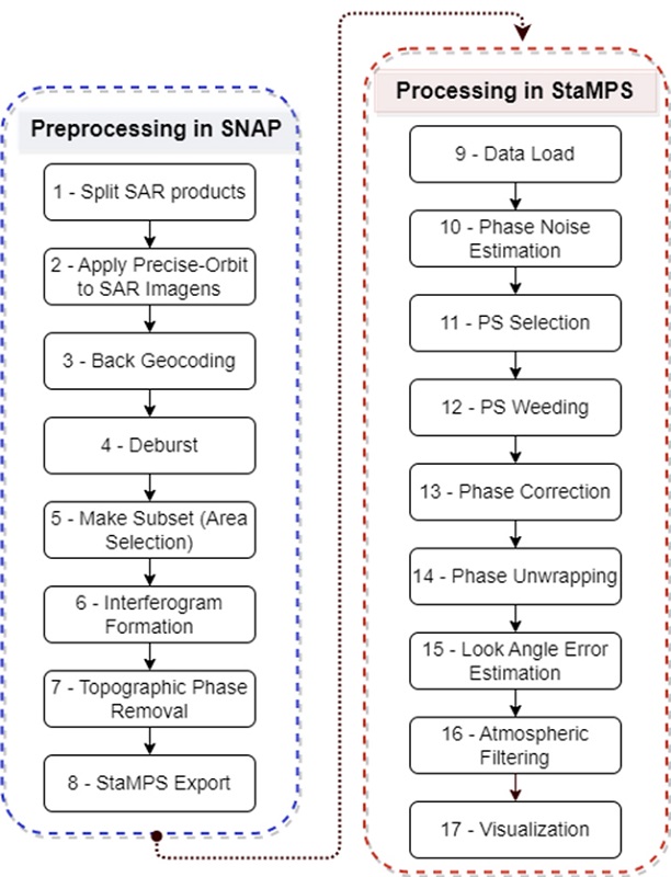 The Sentinel Application Platform (SNAP) platform is a common architecture for all Sentinel Toolboxes and includes a collection of open-source tools for the scientific exploration of Earth observation missions. This platform allows handling data from ESA-SAR missions (Sentinel-1/2/3, ERS-1/2, and ENVISAT) and third-party missions such as COSMO, SkyMed, Radarsat-2, TerraSAR-X, and ALOS PALSAR (Mora 2019). However, SNAP only supports InSAR and DInSAR processing, which means that it is only possible to preprocess SLC-SAR images and consequently generate interferograms that can be exported, for example, to the Stanford Method for Persistent Scatterers (STaMPS) format.