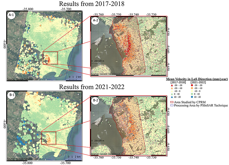 Several studies were compared in the same region as shown in Figure 5A. In that regard, CPRM (2020) detected a velocity rate from -187.99 to -72 mm/year in 2016-2018 and -235.7 to -100 mm/year in 2018-2019. Euillades et al. (2020) employed the SBAS approach using 81 SLC-SAR images acquired by Sentinel 1 (04/2015 and 5/2019), and they identified a subsidence rate that varied from 20 to -20 mm/year. Vassileva et al. (2021) measured the surface displacement for the last 16 years using the multi-temporal DInSAR technique (SBAS); they ignored the horizontal component and converted the LoS displacement into vertical-only components, and then they identified displacement that gradually intensified to approximately 10 cm/year in 2007-2008 and reached approximately 12 cm/year in 2010-2011; in the second period of SAR data coverage, which extends from 03.2015 to 11.2020, they found an initial subsidence velocity of approximately 12 cm/year (2015-2016). In our study, we discovered displacement rates of -32.312 mm/year in 2017-2018 and -24.092 mm/year in 2021-2022; however, they were in the LoS direction.