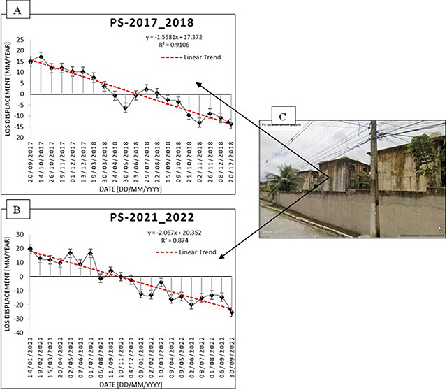 The time series for two points, PS-2017-2018 (latitude -9.63588, longitude -35.7419) and PS-2021-2022 (latitude -9.63575, longitude -35.7416), are presented in Figure 5B and depicted as examples in Figure 6C. The results suggest that the area represented by PS-2017-2018 (Figure 6A) and PS-2021-2022 (Figure 6B) experienced subsidence in both 2017-2018 and 2021-2022. Other PSs in the Pinheiro neighborhood show similar trends, with some areas exhibiting more deformation than others.