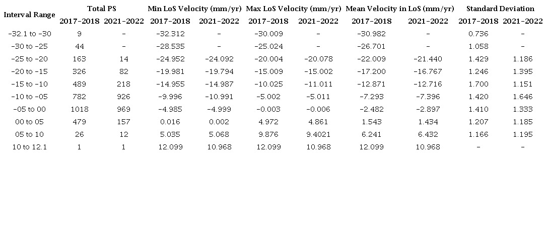 Table 1 contains a list of the intervals shown in Figure 5A. According to this information, a total of 53 PSs were found in the intervals from -32.3 to -30 and -30 to -25 in the years 2017-2018; consequently, at the same interval, no PSs were identified from 2021 to 2022. In comparison, 14 PSs were recognized between -25 and -20 in 2021-2022, and 163 PSs in 2017-2018. With this evidence, we may infer that the Pinheiro neighborhood experienced certain displacement rates that were significantly greater in 2017-2018; nonetheless, a similar process was noticed in 2021-2022, although with a lower rate of displacement in LoS.