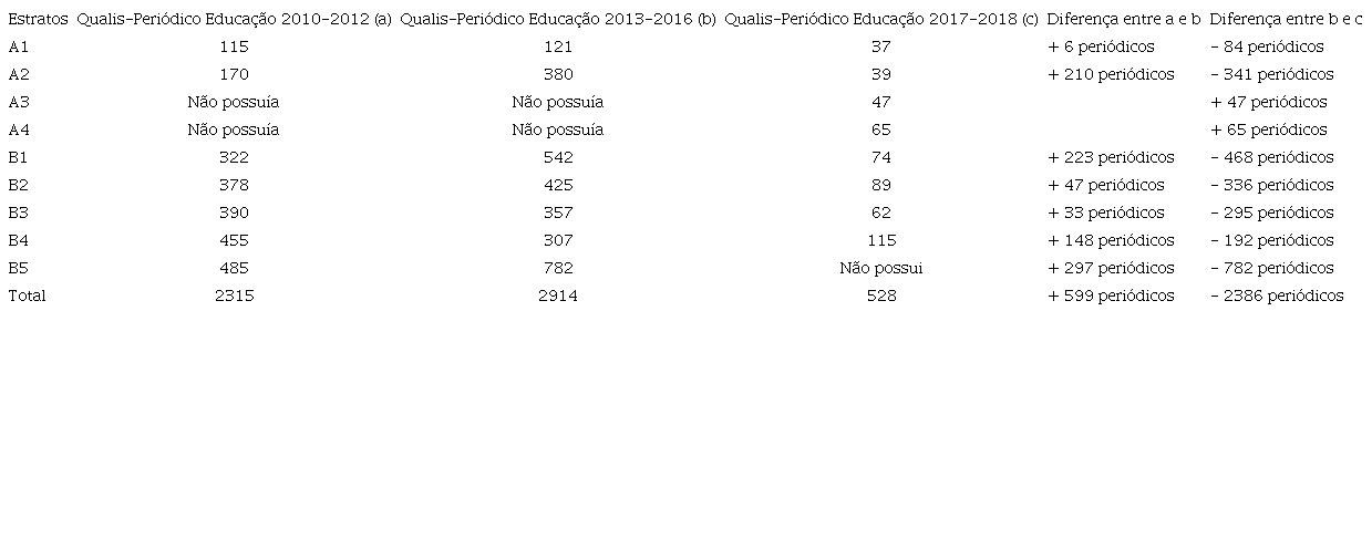 A comissão de avaliação de periódicos educacionais do quadriênio 2013-2016 (CAPES, 2017) observou que houve inclusão de indexadores nos critérios de estratificação porque na classificação anterior revistas A1 ou A2 necessitavam estar indexadas no Scielo, medidor considerado muito restritivo. Em verdade, no triênio 2010-2012 não havia nenhuma exigência quanto a indexadores específicos. Com relação aos demais critérios, a avaliação 2013 e 2017 manteve-se inalterada. Até 2016, os periódicos eram classificados com base nas travas obrigatórias que determinavam que 25% deveria ser A1 + A2, sendo que A1 deveria ser menor que A2; 25% deveria ser B1 e 50% estavam direcionados aos estratos: B2, B3, B4 e B5 (CAPES, 2021). Para a classificação 2017-2020 - e para a análise feita em 2019, considerando o período 2017 e 2018 - há uma reorganização dos estratos, como dissemos, e se propõe que A1 < A2; A1 + A2 < A3 + A4; A1 + A2 + A3 + A4 ≤ 50%, assim, os demais periódicos estariam nos estratos B1, B2, B3 e B4. Aqueles que não fossem considerados revistas científicas estariam no estrato C (CAPES, 2019).