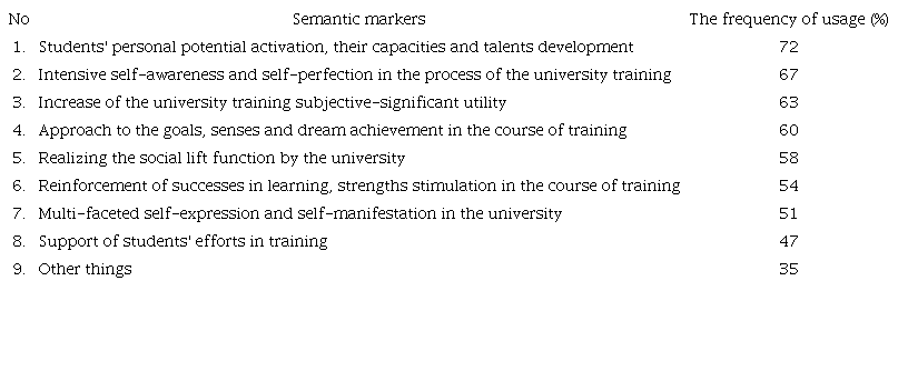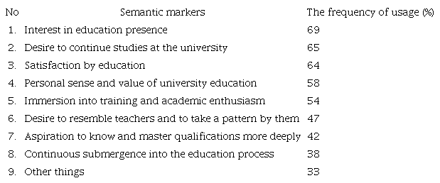 Thesaurus clusters and semantic markers of conditions for students' self-fulfillment. The first community of answers contains statements, opinions, connotations, and inferences that reflect the direct attitude of students to learning activity, to teaching classes at the university, as well as the significance of this activity for student person development. The responses included in this group emphasized mainly the subjective significance of the learning and the high learning motivation in general. Table 1 represents the most prevalent semantic markers from students responses that were assigned to the first thesaurus cluster of their perceptions of conditions from the standpoint of readiness for self-fulfillment in university training are given in percentage terms (at the rate of 100 % detection of each marker in all respondents). The markers list is displayed in descending order: on the upper lines are those that are more often used in student answers, and the less common ones are located in the lower ranks.