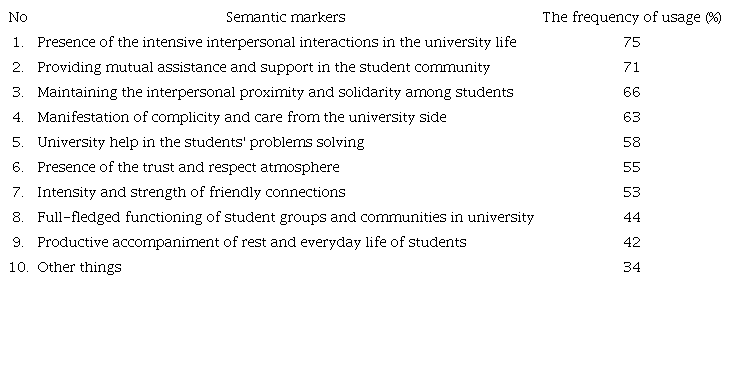 Table 3 demonstrates semantic markers of students' responses, reflecting the significance of various kinds of social support and acceptance for sustainable self-fulfillment in the university environment. The presented semantic markers were included in the third thesaurus cluster of the conditions for students' self-fulfillment in the university environment.