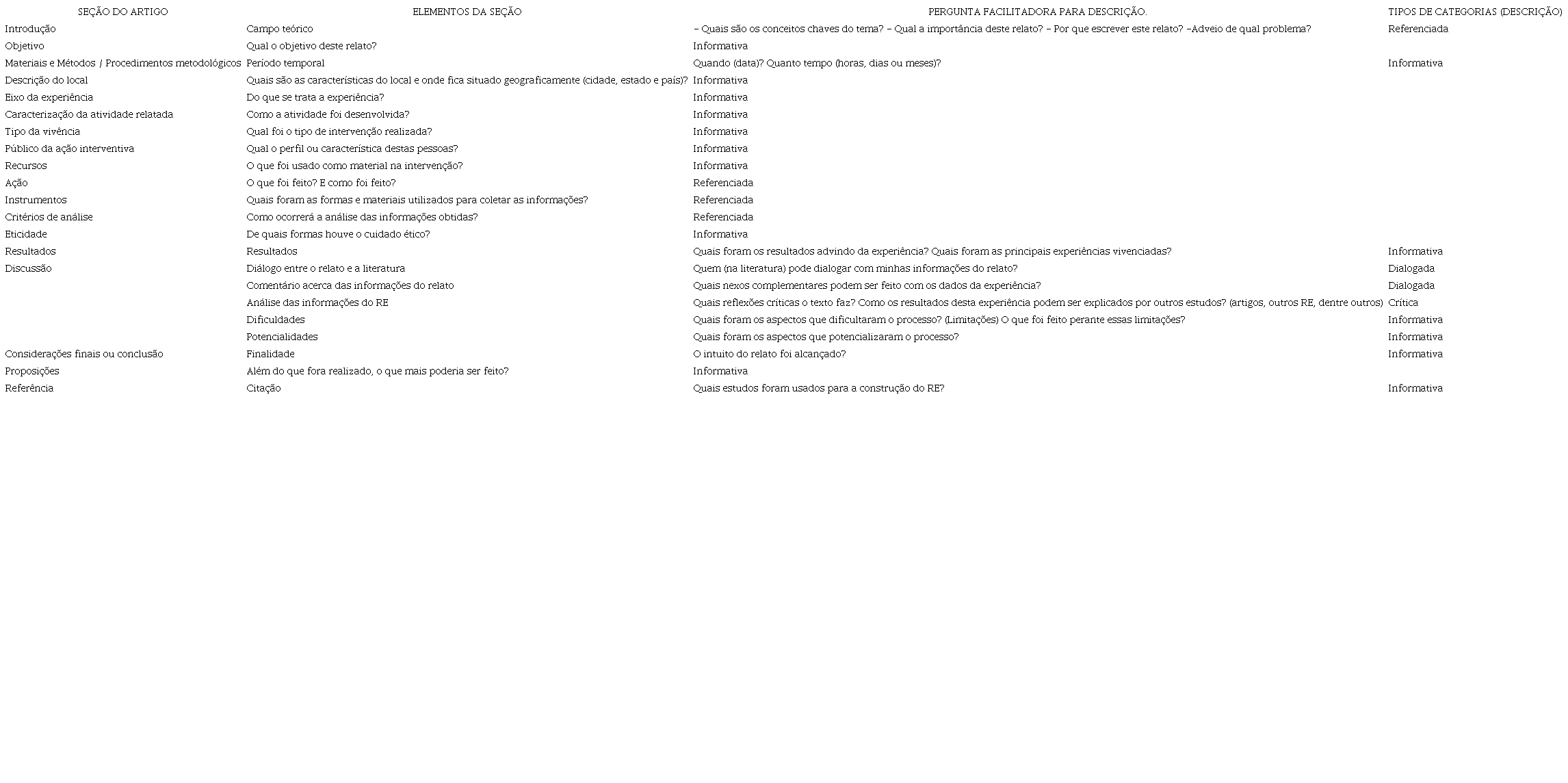 Na sequência, será apresentada uma sugestão de roteiro para construção do RE como possibilidade de uso, sobretudo, na área de educação e ensino. O Quadro 1 cita as seções do artigo e elenca os elementos de cada seção com sua respectiva pergunta facilitadora para a descrição, de modo que o autor ou autora possa compreender e contemplar informações peculiares no artigo.