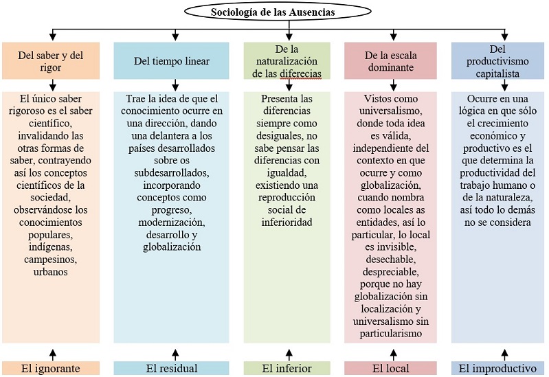 A esta ausencia, en que su producción es el resultado de cinco modos de producción de mono culturas, Santos (2010, 2011) propone la terminología “Sociología de las Ausencias”, donde intenta mostrar que hay realidades y experiencias que se vuelven invisibles a la realidad hegemónica del mundo que provoca la sustracción del presente (Figura 1).