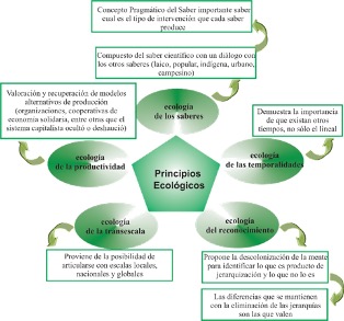 El primer movimiento es la racionalidad ambiental, aquí se traen ejemplos teóricos de Boaventura de Sousa Santos y Félix Guattari. Santos (2010, 2011), en este caso, propone la implantación de la ecología de los saberes, pautado en cinco principios ecológicos (Figura 2).
