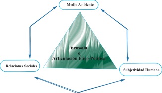 Guattari (2001), por su parte, propone tres registros ecológicos: medioambiente, relaciones sociales y subjetividad humana, mientras que, para el autor, sólo la articulación ético política - lo que él denomina de ecosofía - entre estos tres registros podrán aclarar los interrogantes ambientales (Figura 3), pues hay una “estandarización de los comportamientos” y una “aceleración de las mutaciones técnico científicas” (GUATTARI, 2001, p. 8).