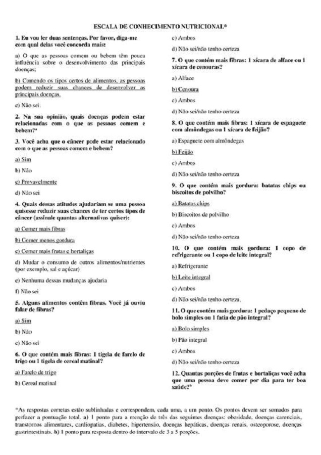 SCAGLIUSI, Fernanda Baeza et al. Tradução, adaptação e avaliação psicométrica da Escala de Conhecimento Nutricional do National Health Interview Survey Cancer Epidemiology. Rev. Nutr., Campinas, v. 19, n. 4, p. 425-436, Aug. 2006. https://doi.org/10.1590/S1415-52732006000400002