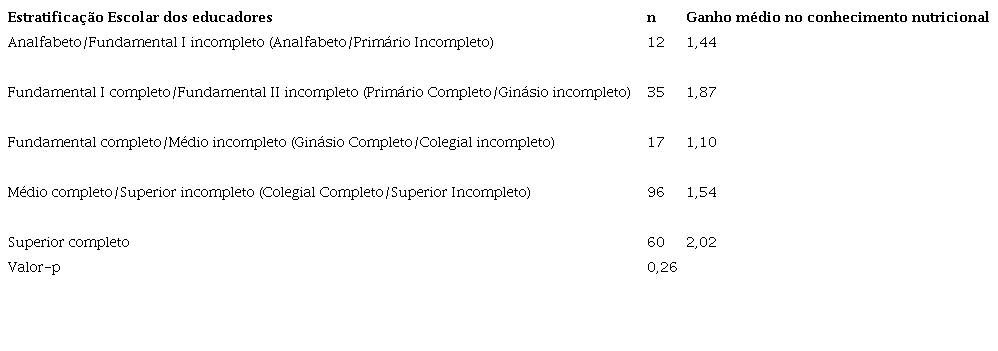 Para avaliar se a diferença do conhecimento nutricional provocada pela intervenção dependia da escolaridade dos educadores, foi utilizada Análise de Variância. Nesta etapa, foi analisado o efeito de cinco categorias de Estratificação escolar (variável independente) sobre a variável ganho de conhecimento (variável dependente). Para cada participante, o ganho de conhecimento foi definido como a diferença entre as notas após e antes da intervenção.