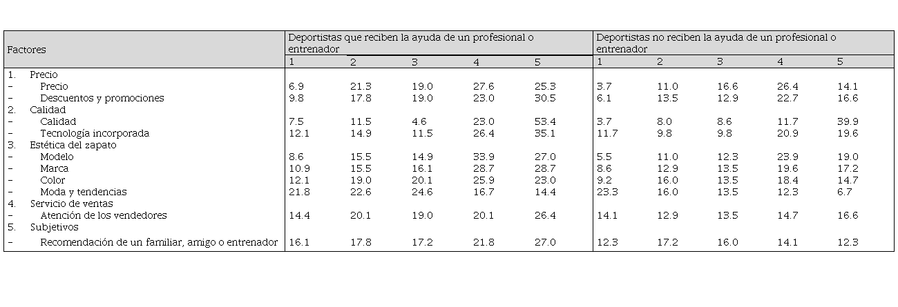 En la Tabla 8 se observa que para el 28.7 % de los deportistas que reciben la ayuda de un profesional o entrenador la marca del zapato ahora representa un factor muy importante en su elección. La moda y tendencias es un factor que ha aumentado en importancia para el 24.6 % de encuestados. Por último, las recomendaciones de familiares, amigos o entrenadores se vuelve un elemento de gran importancia para el 27 % de los deportistas encuestados.