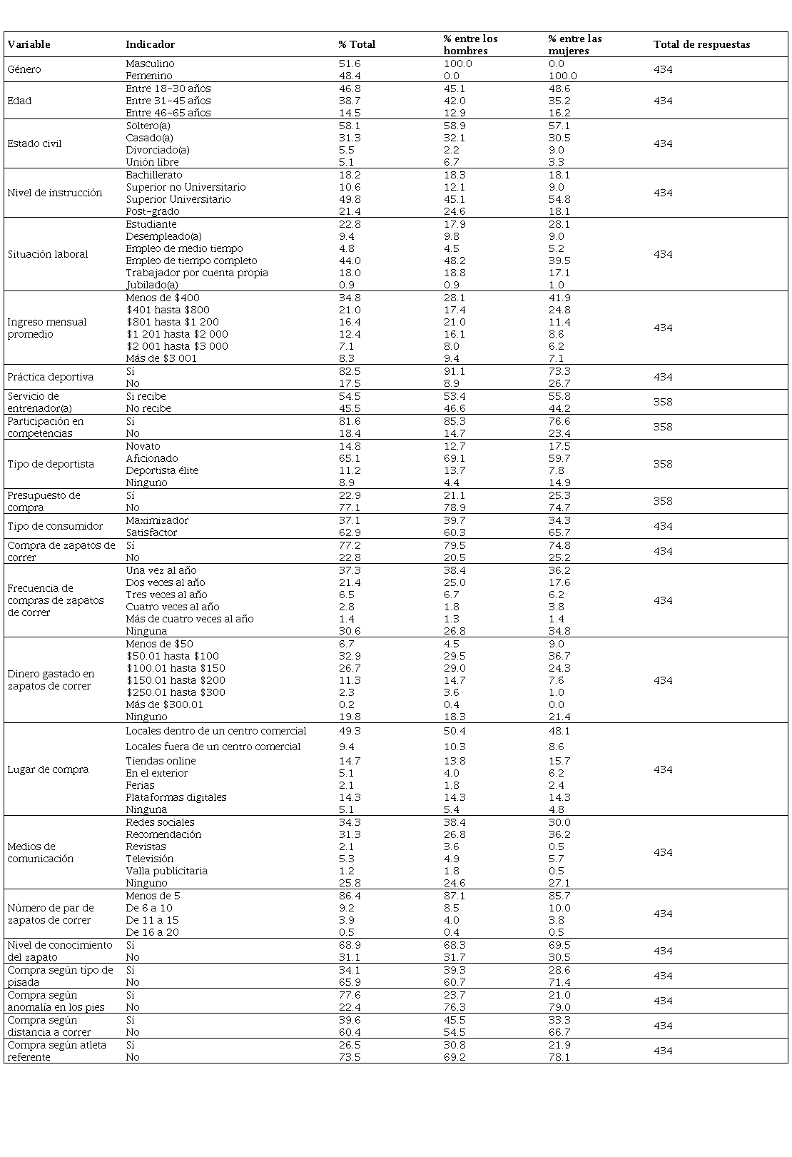 Del total de la muestra, el 77.2 % de personas adquieren zapatos de correr, en el caso de los hombres este porcentaje es del 79.5 % y el de las mujeres es de 74.8 %. Gran parte de las personas compran zapatos una vez al año (37.3 %) y dos veces al año (21.4 %). Aproximadamente, el 32.9 % de personas gasta entre $50.01 y $100 en un par de zapatos de correr y el 26.7 % entre $100.01 y $150.