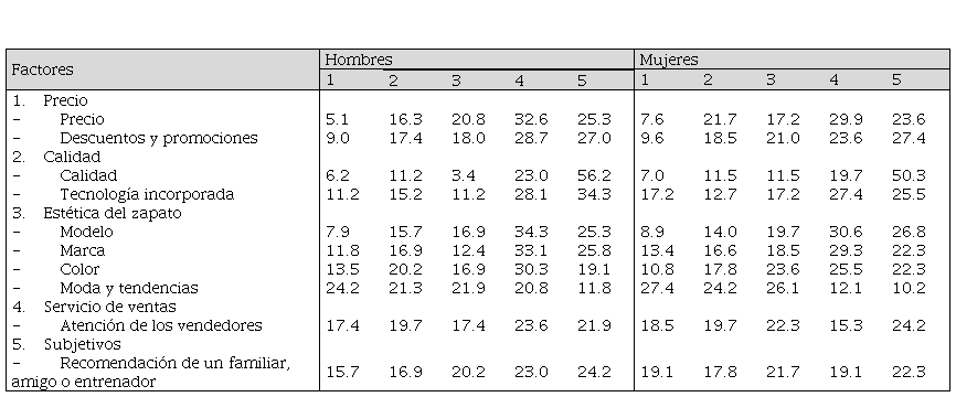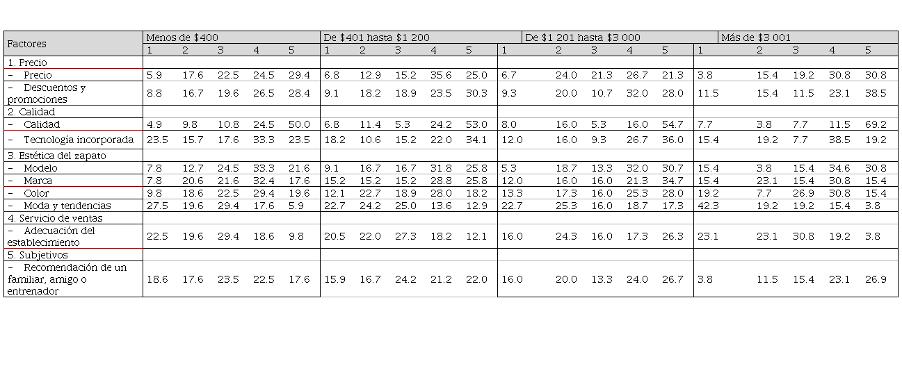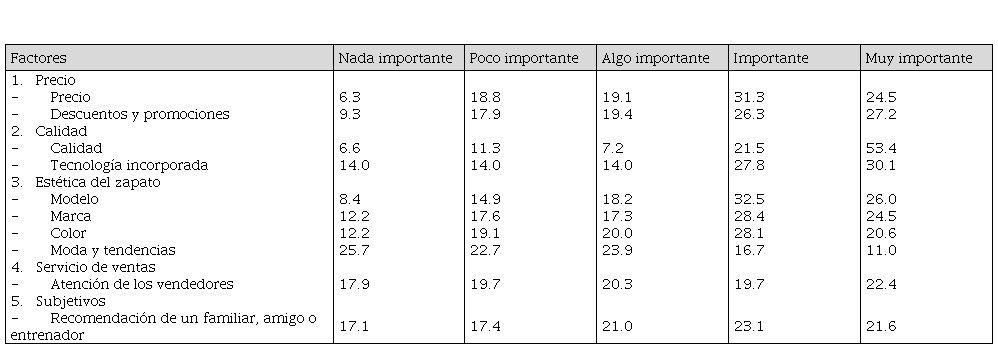 Los resultados reflejan que para los consumidores de zapatos de correr los descuentos y promociones (27.2 %), la calidad del zapato (53.4 %), la tecnología incorporada (30.1 %) y la atención de los vendedores (22.4 %) son factores muy importantes al momento de escoger un par de zapatos de correr. El precio (31.3 %), el modelo (32.5 %), la marca del zapato (28.4 %), el color (28.1 %) y la recomendación de un familiar, amigo o entrenador (23.1 %) son factores que la persona identifica como importantes cuando elige zapatos de correr. Finalmente, la moda y tendencias de la sociedad es un factor nada importante para el 25.7 % de los consumidores.