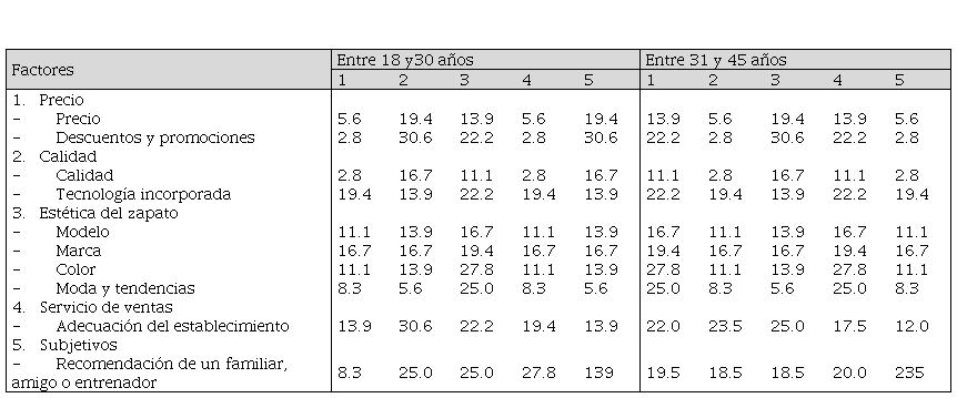 En la investigación se revela que para las personas entre 18 hasta 30 años los factores precio (44.4 %), calidad (44.4 %) y ciertos factores estéticos del zapato como modelo (38.9 %) y marca (25 %) son muy importantes para el consumidor cuando elige un zapato de correr. Estos resultados coinciden con Ohl y Tribou (2004) quienes mencionan que “jóvenes menores de 30 años le dan más importancia a la marca, calidad y estética; mientras que las personas mayores de 40 años buscan más confort en su elección” (p. 186).