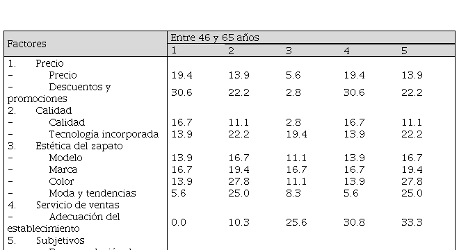 Para las personas entre los 31 y 45 años, la marca del zapato (28.5 %) y la recomendación de un familiar, amigo o entrenador (23.5 %) son factores muy importantes en la elección de un par de zapatos de correr. Por último, la recomendación de una persona (38.5 %) es un factor importante para los encuestados entre los 46 y 65 años (ver Tabla 4 y 5).