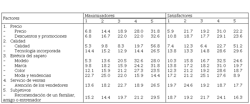 En la Tabla 6 se observa que para las personas maximizadoras, el precio (31.8 %), la marca del zapato (31.8 %), el color (23.5 %) y la recomendación de un familiar, amigo o entrenador (29.5 %) son factores de gran importancia en la elección de un par de zapatos de correr. Por su parte, el 29.1 % de personas con personalidad satisfactora consideran los descuentos y promociones como un factor importante en su elección de zapatos de correr. Pero la moda y tendencias aumentan significativamente su nivel de importancia para el 27.6 % de encuestados.
