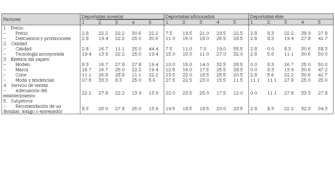 Los deportistas aficionados no tienen mayores cambios en sus preferencias. Sin embargo, para los deportistas de élite o de alto rendimiento, los factores estéticos del zapato como modelo (50 %), marca (47.2 %) y el color del zapato (41.7 %) tiene mucha más importancia en su elección de zapatos. De igual forma, la recomendación de un familiar, amigo o entrenador para el 34.3 % de deportistas es un factor muy importante al momento de comprar un zapato de correr (ver Tabla 7).