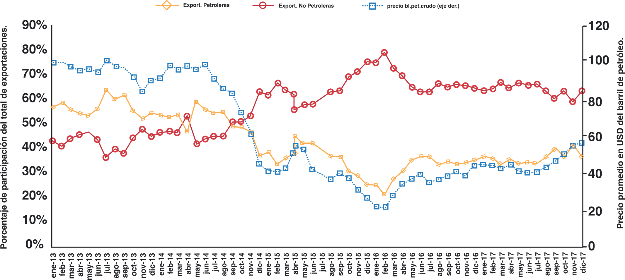 A partir del año 2014 hasta el año 2017 las exportaciones no petroleras ecuatorianas comienzan a dominar en porcentaje su participación en las exportaciones totales del país como se puede observar en la figura 1, esto agregado a que el petróleo es un bien no renovable, genera la necesidad de perspectivas futuras sin dependencia de petróleo y que incentiven la participación mayoritaria de exportaciones no petroleras.