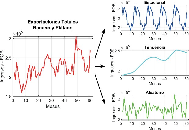 Como se puede observar en la figura 2, los componentes son de tendencia estacional e irregular, esta último será sujeto de estudio, pues se representa la aleatoriedad existente en ingresos FOB por exportaciones de banano y plátano al Estado ecuatoriano. Dicho estudio permite sentar bases para controlar tal variabilidad y poder mantener y planificar los ingresos a futuro.