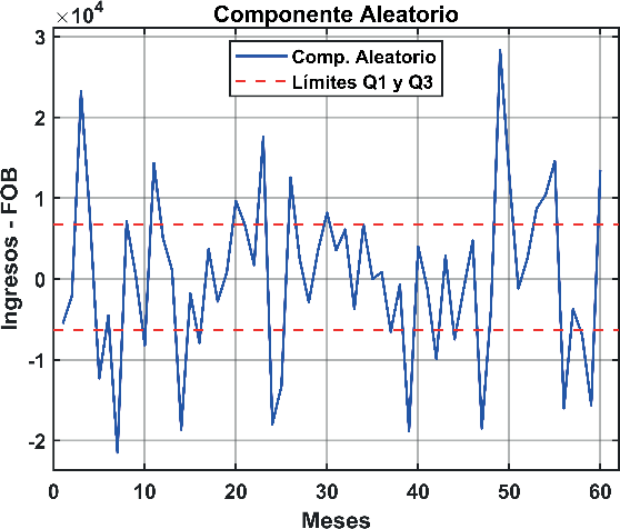 Al extraer el componente aleatorio de la serie que se puede observar en la figura 3, se identifica que todos los puntos contienen aleatoriedad y eso es natural en las exportaciones de un país; sin embargo, al revisar los valores FOB en bruto del componente, se identifica que varios son despreciables debido a su valor-cantidad, en contraste con la serie original, por lo cual se aplica el cálculo de cuartiles al componente aleatorio y se califican como picos relevantes sobre el primer cuartil y bajo el 3º cuartil, dada la naturaleza positiva y negativa de los mismos. En la fi gura 3 se puede observar el seccionamiento del componente aleatorio.