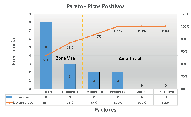 Si bien los ítems generales ya dan una pauta de las causas que provocan la variabilidad de ingresos FOB, también se presentan de diferente naturaleza en la serie, por lo cual se proceden a calificar mediante categorías, llamadas factores claves a gestionar dentro de las exportaciones ecuatorianas; estos factores son: político, económico, social, tecnológico, ambiental y productivo, con los cuales se procede a aplicar el proceso mencionado y a generar diagramas de Pareto, que se pueden identificar en las figuras 4 y 5.