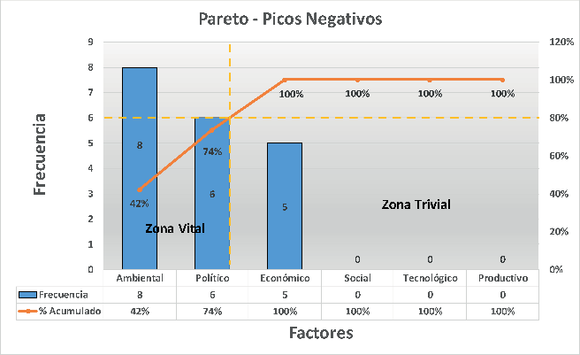 Una vez identificadas las referidas causas, se procedió a clasificarlas a través de un análisis de entorno empresarial (PESTEL). Con los resultados obtenidos se procedió a la construcción de diagramas de Pareto para cada subgrupo de picos, identificando las zonas vitales y triviales, así como también los factores clave que incidieron en las variaciones de ingresos FOB por exportaciones de banano y plátano, en el período comprendido entre los años 2013 y 2017.