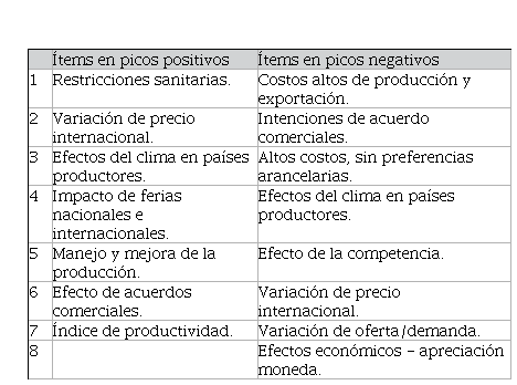 En la sección anterior los picos relevantes fueron identificados, clasificados y etiquetados, en la presente sección cada uno de los veintinueve picos fueron analizados mediante investigación documental de organismos oficiales y producción científica asociada, permitiendo determinar la causa que dio origen al pico de ingresos FOB por exportación de banano y plátano en la serie temporal. Los ítems encontrados se pueden observar en la tabla 2.