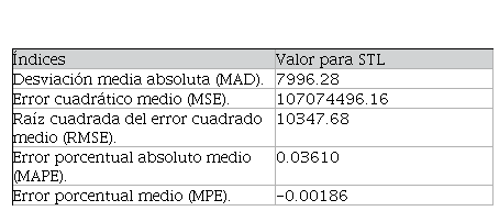 Para el caso del proceso de estudio de una serie temporal como la del presente proyecto, se determinó la necesidad de establecer previamente criterios relevantes que permitan seleccionar el método y parámetros de descomposición adecuados, obteniendo indicadores de ajuste idóneos, pues se calcularon los errores del porcentual absoluto medio con 3.6 % y un porcentual medio de -0.1 %.