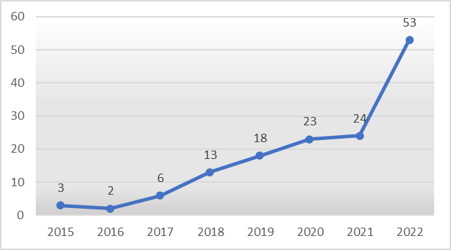 La Figura 2 muestra la tendencia cuantitativa de los resultados. Hay un aumento en la tendencia de publicar artículos, el crecimiento ha sido al alza. Con la publicación de 53 artículos, la mayor cantidad de artículos en este campo se publicaron en 2022, seguido de 2021 y 2020 con 24 y 23 artículos, respectivamente. En el último año se aprecia un gran crecimiento de las publicaciones acerca de esta temática