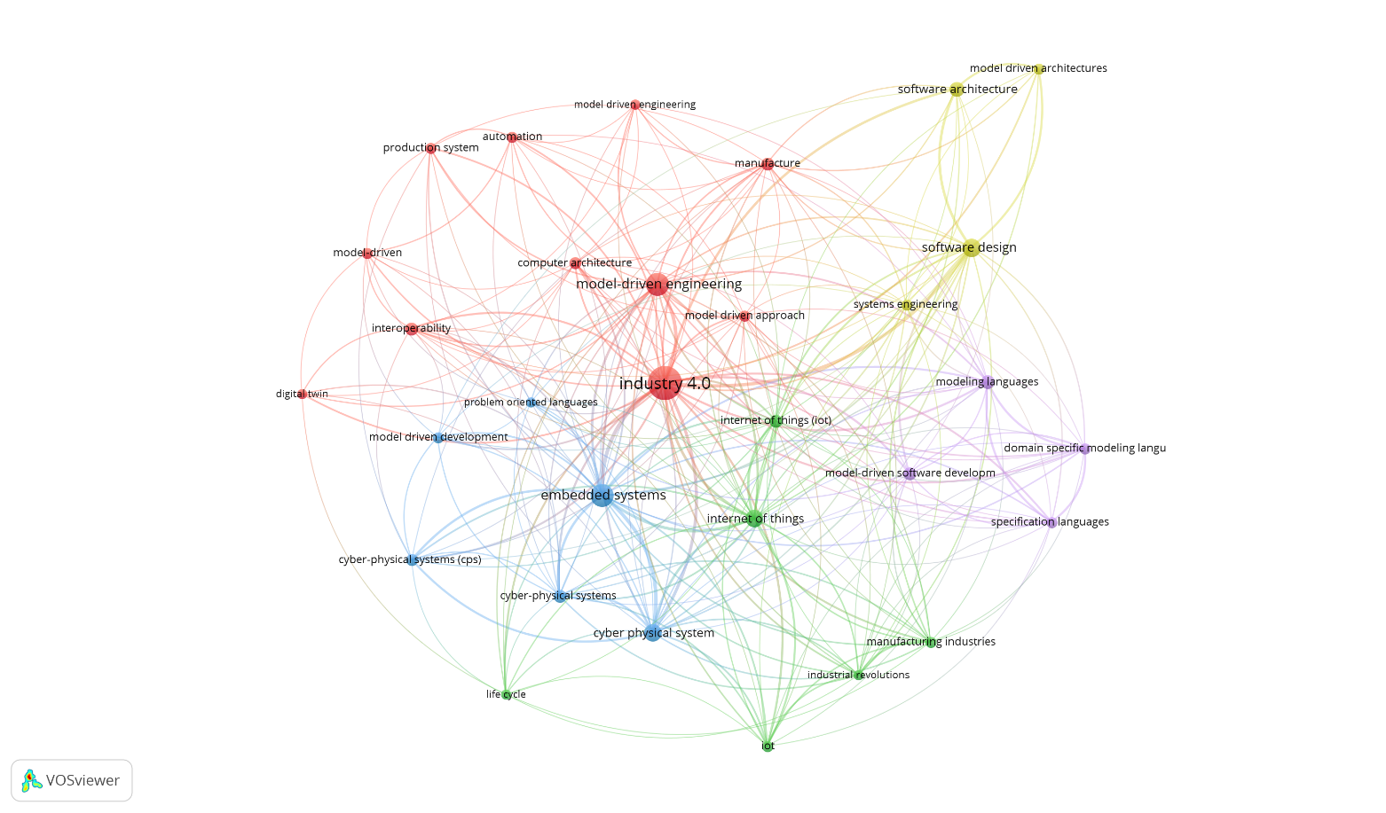 El grupo más grande contiene 11 palabras clave que están resaltadas en rojo en la Figura 4. Las palabras clave en este grupo incluyen la Industria 4.0, ingeniería basada en modelos, fabricación, interoperabilidad y automatización. En este clúster, la Industria 4.0 y la basada en modelos son los temas principales.