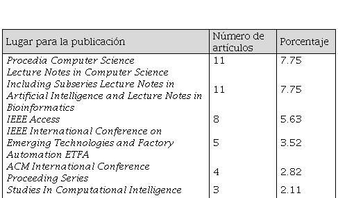 Los lugares preferidos para la publicación son ProcediaComputer Science, Lecture Notes in Computer Science, IEEE Acess .IEEE International Conference on Emerging Technologies and Factory Automation ETFA, tal como se muestra en la Tabla 2. Con respecto a las revistas, las que más publicaciones tienen en este campo son Software and System Modeling Journal e IEEE Access Journal.