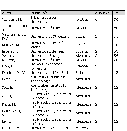 La Tabla 3 muestra los nombres de 18 investigadores que publicaron al menos dos artículos en el campo de los enfoques basados en modelos y la Industria 4.0 y que han sido citados (para esos artículos) al menos 10 veces. Manuel Wimmer es el autor más activo en el campo analizado. Ha publicado 6 artículos en el campo de los enfoques basados en modelos y la Industria 4.0, mientras que el promedio del número de artículos por autor es de 1.22. También tiene la tasa de citas más alta (94) y el tercer índice H más alto (31) entre todos los investigadores en el campo. Manuel Wimmer es profesor en Karlsruher Institut für Technologie, Alemania.
