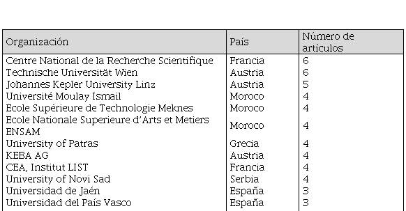 En cuanto a la PI5, cabe destacar que en la publicación de los 142 artículos analizados han colaborado 167 organizaciones diferentes. El Centre Nactional de la Recherche Scientifique de Francia y la Technische Universität Wien de Austria están a la cabeza con seis publicaciones de artículos en este campo, seguidos por la Universidad Johannes Kepler de Austria con cinco artículos. La Tabla 4 muestra una lista de las 14 principales organizaciones con al menos tres artículos publicados en el campo de los enfoques basados en modelos y la Industria 4.0. Una revisión de esta lista muestra que las organizaciones están ubicadas principalmente en Europa, pero también en África. Cuatro de las 14 universidades son de Austria y tres son de Francia y Marruecos.