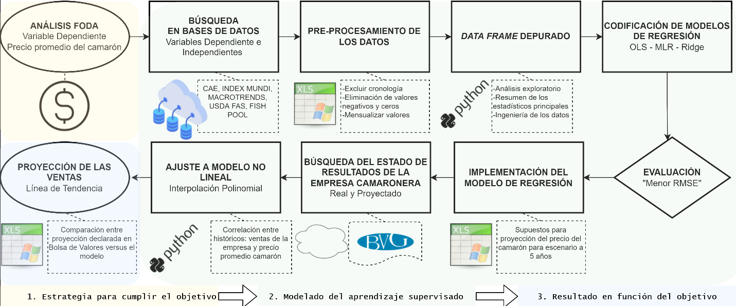 Abstract: This research develops the best approximation for the non-linear projection of sales of a shrimp company listed on the Stock Exchange, in contrast to published corporate linear estimates. It starts from the search for data through a SWOT of the variable of interest: average price of Ecuadorian shrimp, identifying the variables: explanatory of shrimp prices in the United States, the observed change of the dollar against the yuan, Ecuadorian exports, US imports of Indian shrimp, barrel of WTI crude oil and the FPI™ salmon price index, as the most influential interpreted by the result of an adjusted coefficient of determination of 0.807. The instrumentation of the econometric model evaluates the statistical indicators of three predictive supervised learning linear regression algorithms in the Python programming language, with Ridge being the model with the lowest mean square error equal to 0.274. Based on five-year assumptions with Ridge, sales are forecast from 2021 to 2025, correlating the variables historical revenue of the shrimp company versus the average price of shrimp through polynomial interpolation, comparing both resulting trend lines showing that the expected revenues maintain a behavior non-linear according to its historical performance.