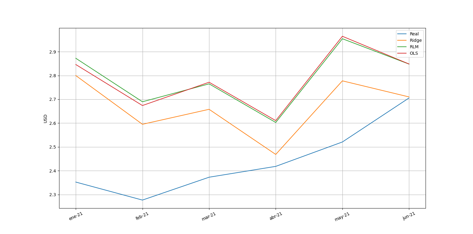 Una vez codificados los tres modelos se representan gráficamente sus valores estimados, los mismos que contrastan con los valores reales de los PPCE como se muestra en la Figura 4. El criterio de evaluación para seleccionar el modelo es el RMSE, siendo el modelo Ridge el que muestra el error de 0.274 (Tabla 4). La técnica de regresión Ridge permite corregir la multicolinealidad en caso de que esta se presente. Esto evita que las variables importantes se descarten, también mantiene la consistencia del modelo luego de efectuar varias simulaciones verificando que el coeficiente Alpha de 1.46 sea el más adecuado frente al conjunto de siete variables presentes en la regresión y, en ciertos casos, con valores resultantes ligeramente superiores a los reales (Nunes et al., 2019).