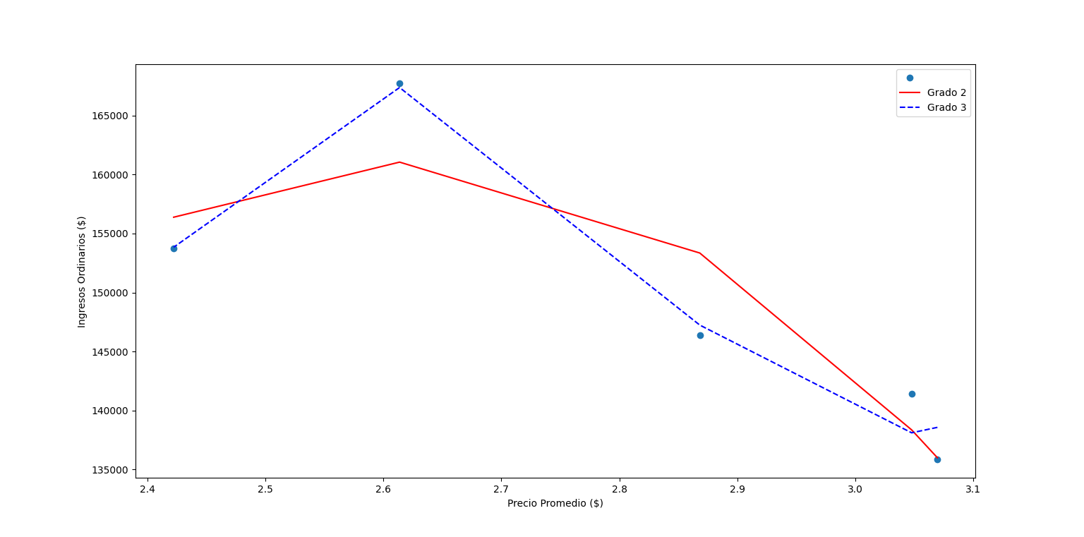 El modelo pronosticará las ventas de camarón mediante regresión polinomial, para lo cual se deberá definir, en función de los PPCE, el grado de la interpolación con mejor interacción entre las variables ventas de camarón y la variable de interés. Será la curva de tercer grado la que mejor se aproxime a la tendencia de los puntos, tal como se puede apreciar en la Figura 5.