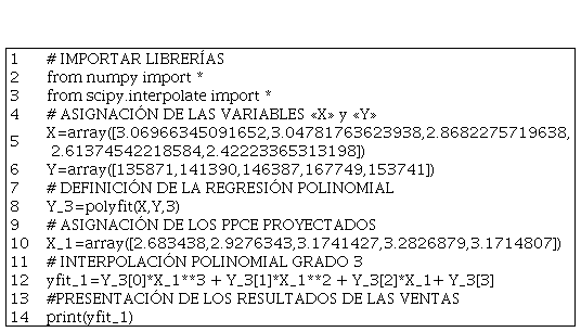 Con los datos históricos de entrada se codificarán, en el lenguaje de programación Python, los ajustes a las predicciones de los PPCE. Esto se lo realizará en un modelo de interpolación polinomial (Virtanen et al., 2020) de grado tres para obtener la estimación de las ventas. Tal como se ha demostrado en los últimos años, es posible identificar las estructuras de los datos de los mercados financieros no lineales con machine learning (Fischer & Krauss, 2018).