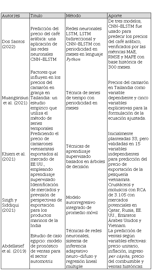 La producción de camarón en Ecuador es un referente mundial (Lucien-Brun, 2018), así como relevante es su contribución a la economía del país, lo que torna imperante el poder aprovechar todos los datos disponibles y combinarlos con las herramientas estadísticas que ofrecen las ciencias de la computación, lo que permitiría aportar con nuevos hallazgos para establecer los posibles escenarios para la toma de decisiones estratégicas para hacer frente a una mayor incertidumbre inherente al Covid-19 (Gordillo et al., 2022). El objetivo de la investigación reside en modelar, con base a algoritmos de machine learning, los pronósticos de ventas de una exportadora de camarones ecuatoriana y contrastarlos con las proyecciones publicadas sobre su futuro financiero.