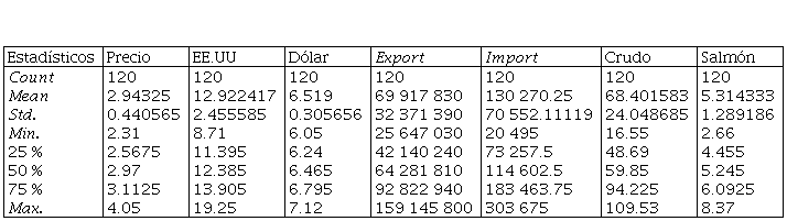Se recabaron registros cronológicos de fuentes consultadas a partir de enero 2011 y se pre-procesaron todos los datos brutos obtenidos de las siete variables que conforman data frame ‘eshrimp’. Esto se encuentra estructurado en 120 filas y siete columnas, cuyos indicadores estadísticos de cada variable se muestran en la Tabla 3.